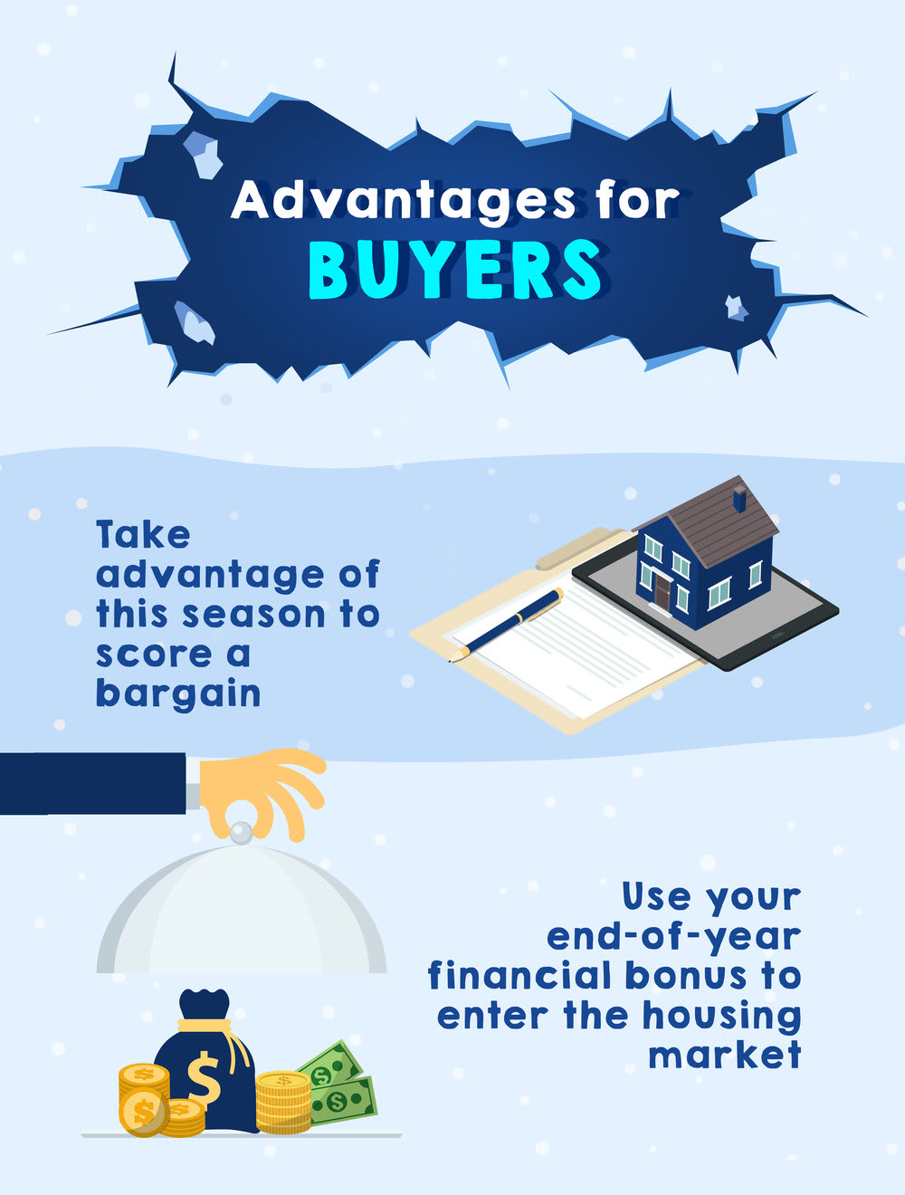 Because more buyers are likely to house hunt during warmer weather, home prices are generally lower in the winter. You can then take advantage of this season and have more buying power since sellers are motivated to sell their home and move before the year ends.