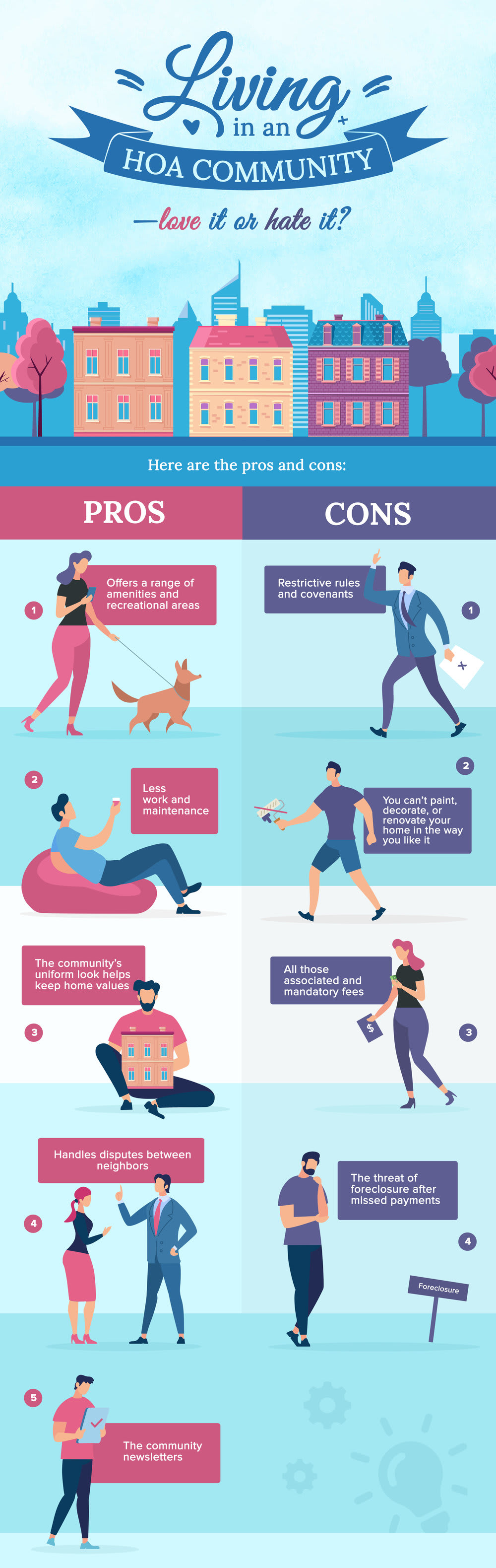 While laws vary by state, an HOA can move to foreclose on your property if you fail to pay the monthly dues or have delinquent assessments by placing a lien on your property. So make sure your budget can handle those fees so you won’t fall behind on payments and risk losing your home.